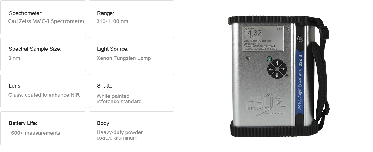 Non-destructively measure dry matter, brix, acidity, and internal & external color.