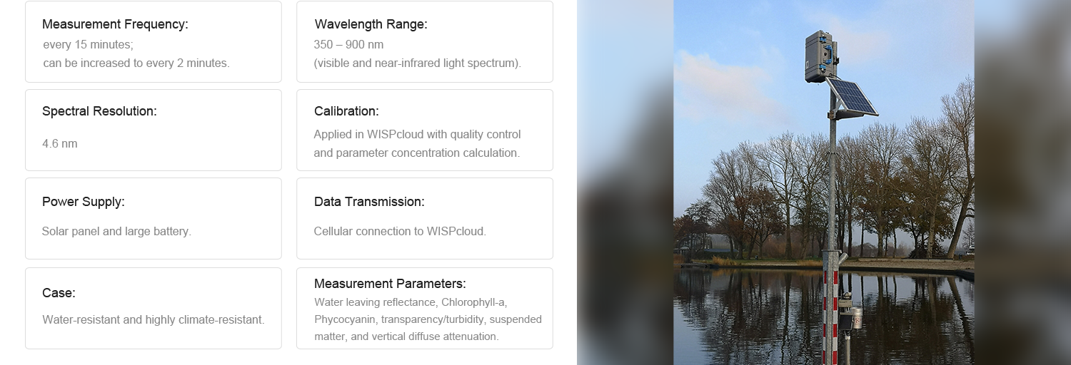 Measures water leaving reflectance, water color, and bio-chemical parameters such as Chlorophyll-a, Phycocyanin, and turbidity.