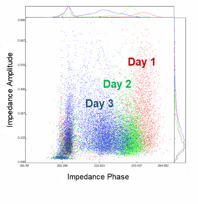Yeast viability can be affected by various factors, such as temperature, pH, and the presence of contaminants. The fermentation of beer was monitored over a course of seven days. In parallel, cell viability and cell concentration were determined. The shift of the viable cell populations every day (Figure C; shift of the populations day 1 red to day 2 green and day 3 blue to the left) indicates a change in metabolic activity: from a low ethanol concentration and aerobic conditions at the beginning the cells change into an anaerobic activity producing large amounts of ethanol after three days (Opitz et al., 2019).