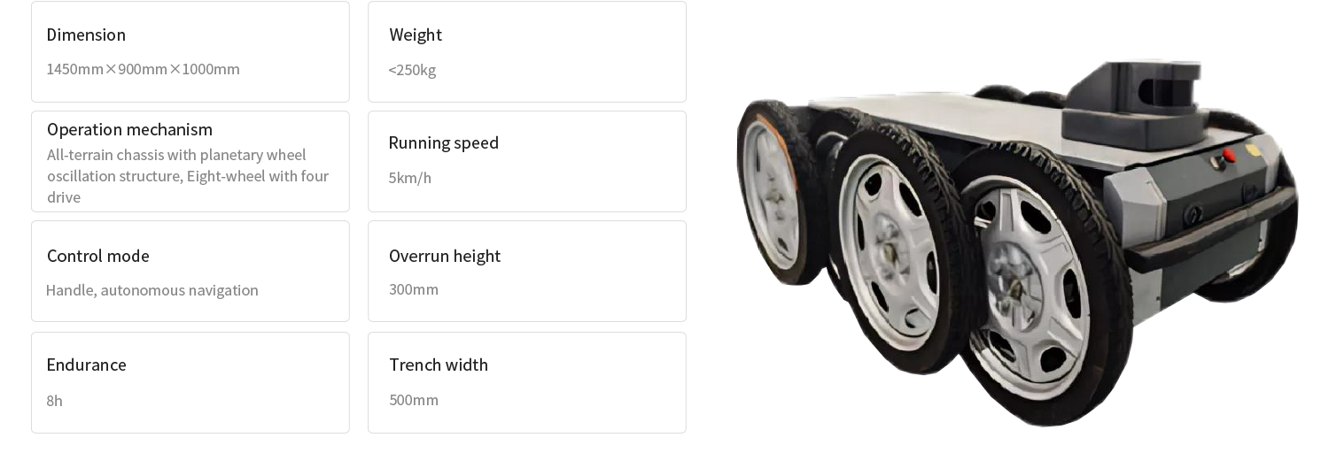 Eight-wheel four-wheel drive planetary swing arm chassis with strong off-road capability and excellent maneuverability.