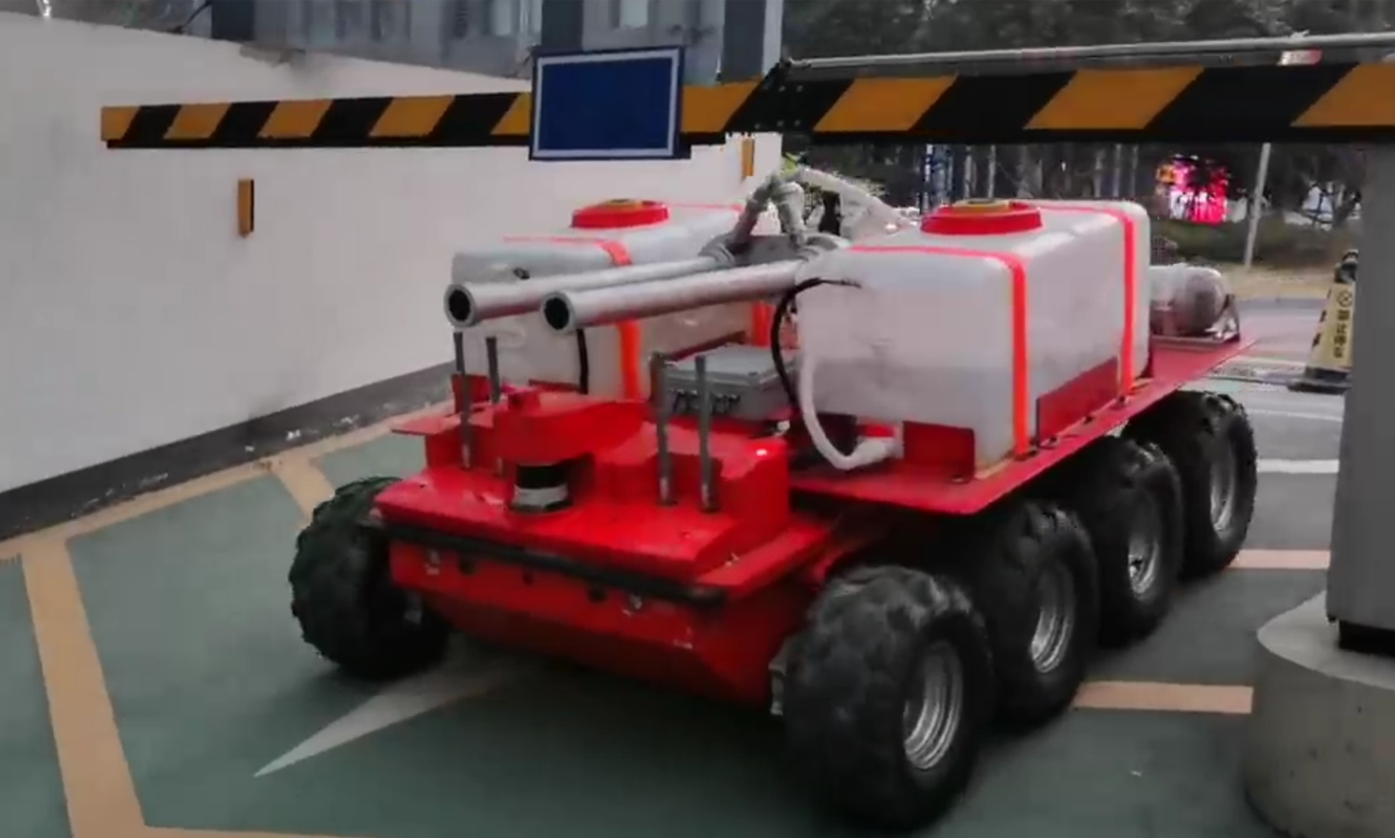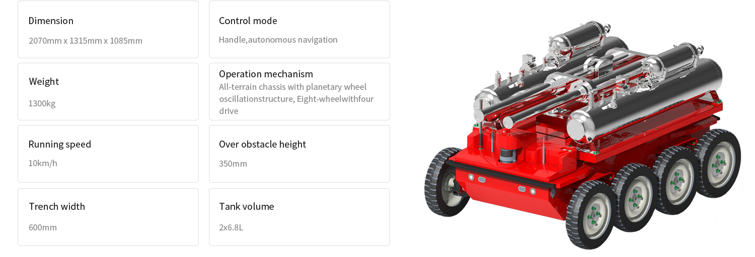 The robot is equipped with a 280L water tank, which eliminates the need for external water supply and reduces the dependence on the fire-fighting environment.