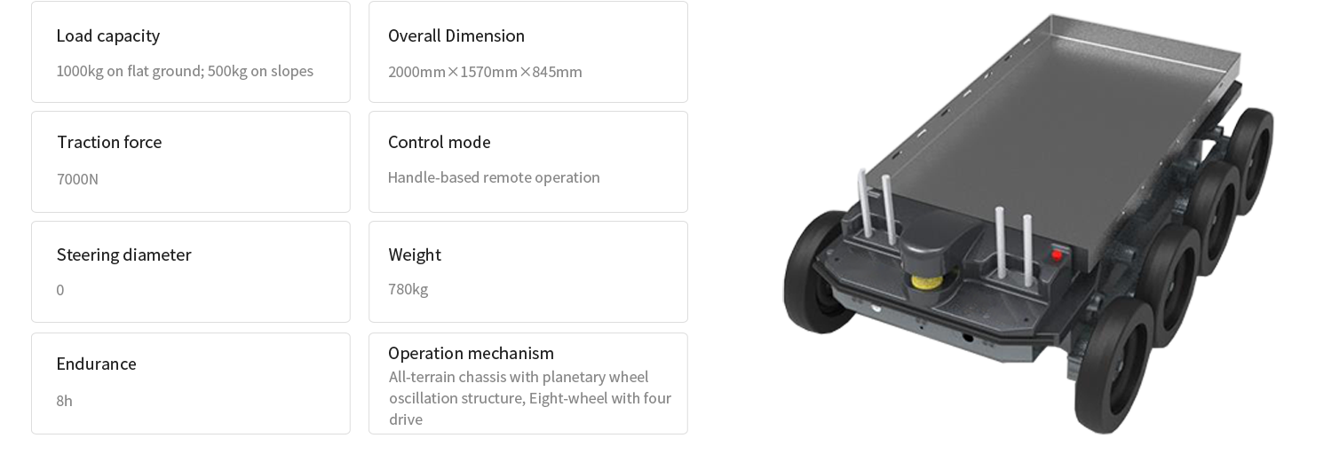 Eight-wheel drive planetary swingarm chassis with strong off-road capability and excellent maneuverability.