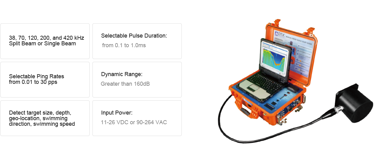 Simultaneously supports multiple transducers and multiple frequencies, 38, 70, 120, 200, and 420 kHz Split Beam or Single Beam.