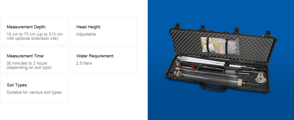 Measurements can be taken 30 minutes to two hours after installation, depending on soil type, and only requiring 2.5 litres of water. These measurements can be made at depths between 15 cm to 75 cm below the soil surface. Optional extensions are available in 80 cm lengths, to allow measurements at a maximum of 315 cm.
